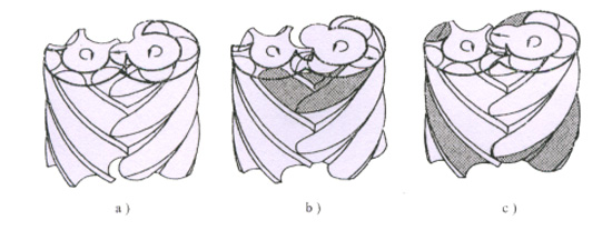 吸氣結束后轉子繼續轉動。螺桿轉子呈螺旋形,轉動過程中,齒間容積產生由大到小的周期性變化,對容積內的氣體產生壓縮,氣體壓力上升。