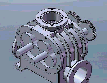 2、臥式羅茨泵:泵的進氣口在上,排氣口在下。有時排氣口水平方向接出,因而,進、排氣方向是相互垂直的。排氣口可以從兩個方向接出,一端接排氣管道,另一端堵死或接旁通閥。這種結構重心低,高速運轉時穩定性好,一般用于大、中型泵。