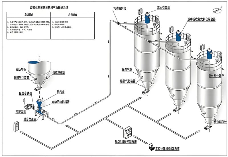 倉泵可以實(shí)現(xiàn)理想中的遠(yuǎn)距離氣力輸送。目前,在國內(nèi)的案例中,輸送距離超過2000米以上并且穩(wěn)定運(yùn)行的只有濃相氣力輸送系統(tǒng)。